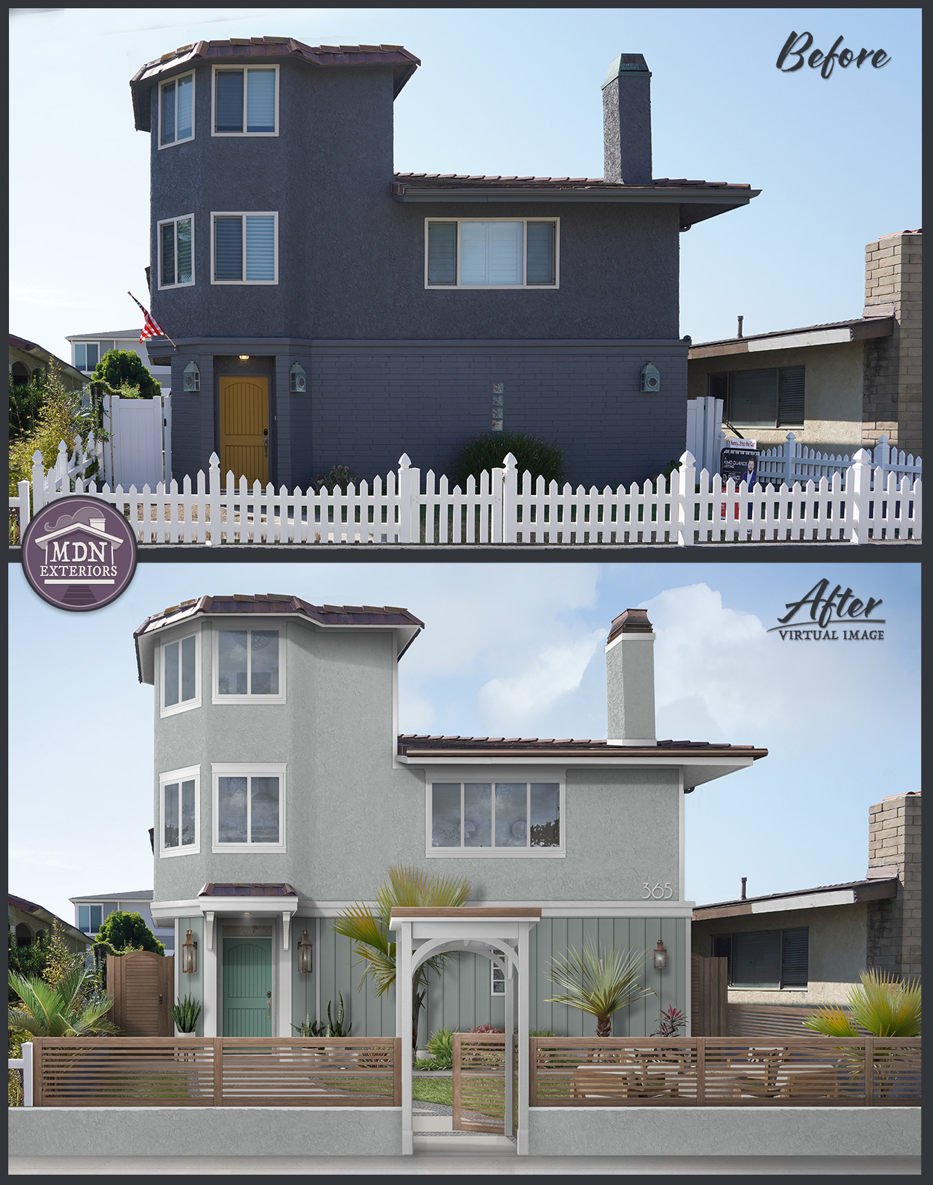 This seaside home was transformed with a soft palette, featuring light gray-green stucco paired with a darker siding for a two-tone appeal. The front entry is refreshed with a teal door and lantern-style sconces that bring warmth and character. Tropical landscaping and an arched gate create a welcoming approach. The result is a Modern Coastal retreat with a fresh, inviting curb appeal.