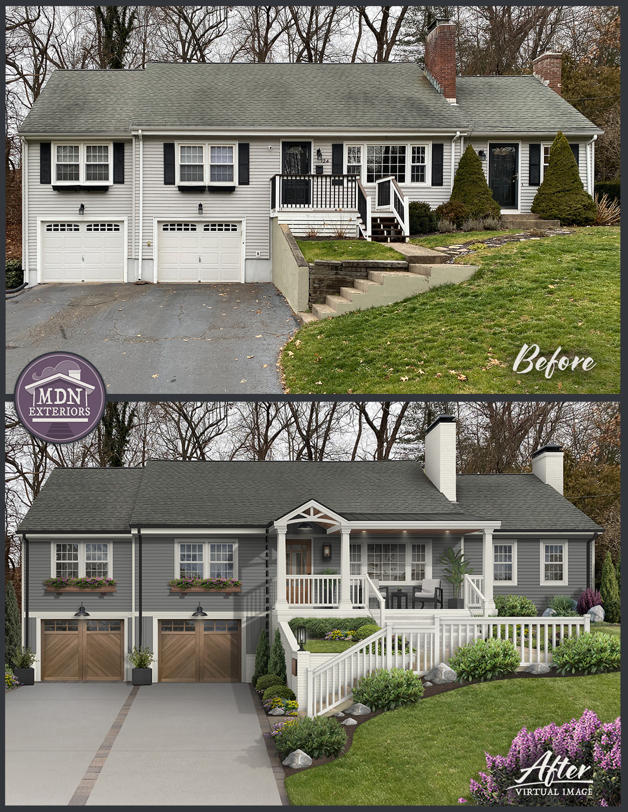 This design embodies a Transitional Colonial style, where classic symmetry and gable-roofed proportions meet contemporary updates. The renovation introduces deeper-toned siding, refined porch detailing, and warm wood garage and entry doors, blending timeless Colonial character with fresh modern curb appeal.