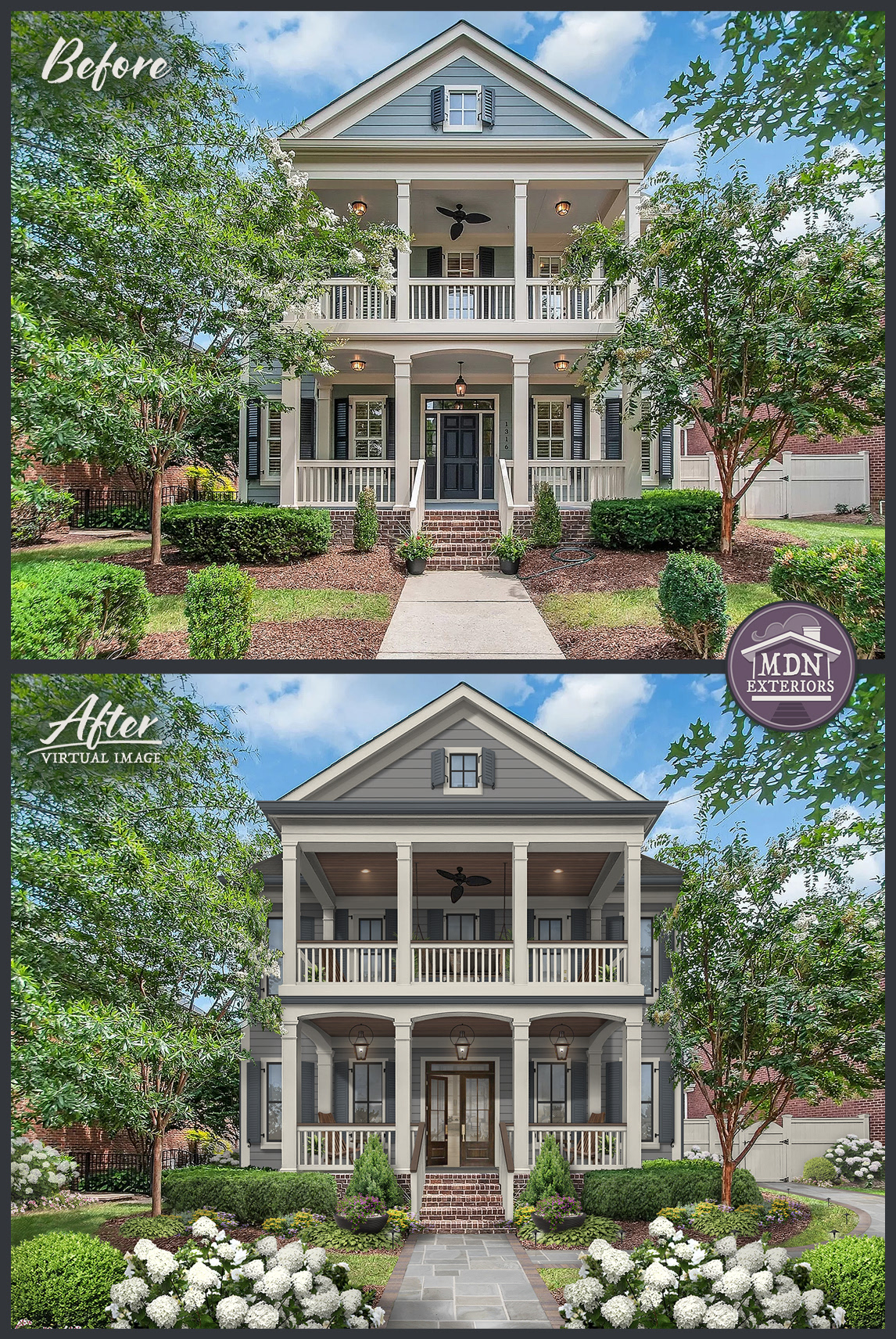 This home was elevated with Colonial Revival influences, combining soft-toned brick and horizontal siding for added texture. Classic columns frame the updated entry, while new dormers, dark-framed windows, and detailed trim strengthen the home’s symmetry stately appeal.