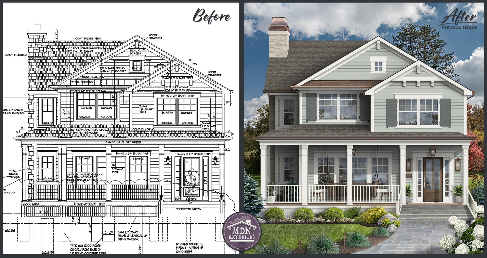 This design embodies a Transitional Colonial style, where classic symmetry and gable-roofed proportions meet contemporary updates. The renovation introduces deeper-toned siding, refined porch detailing, and warm wood garage and entry doors, blending timeless Colonial character with fresh modern curb appeal.
