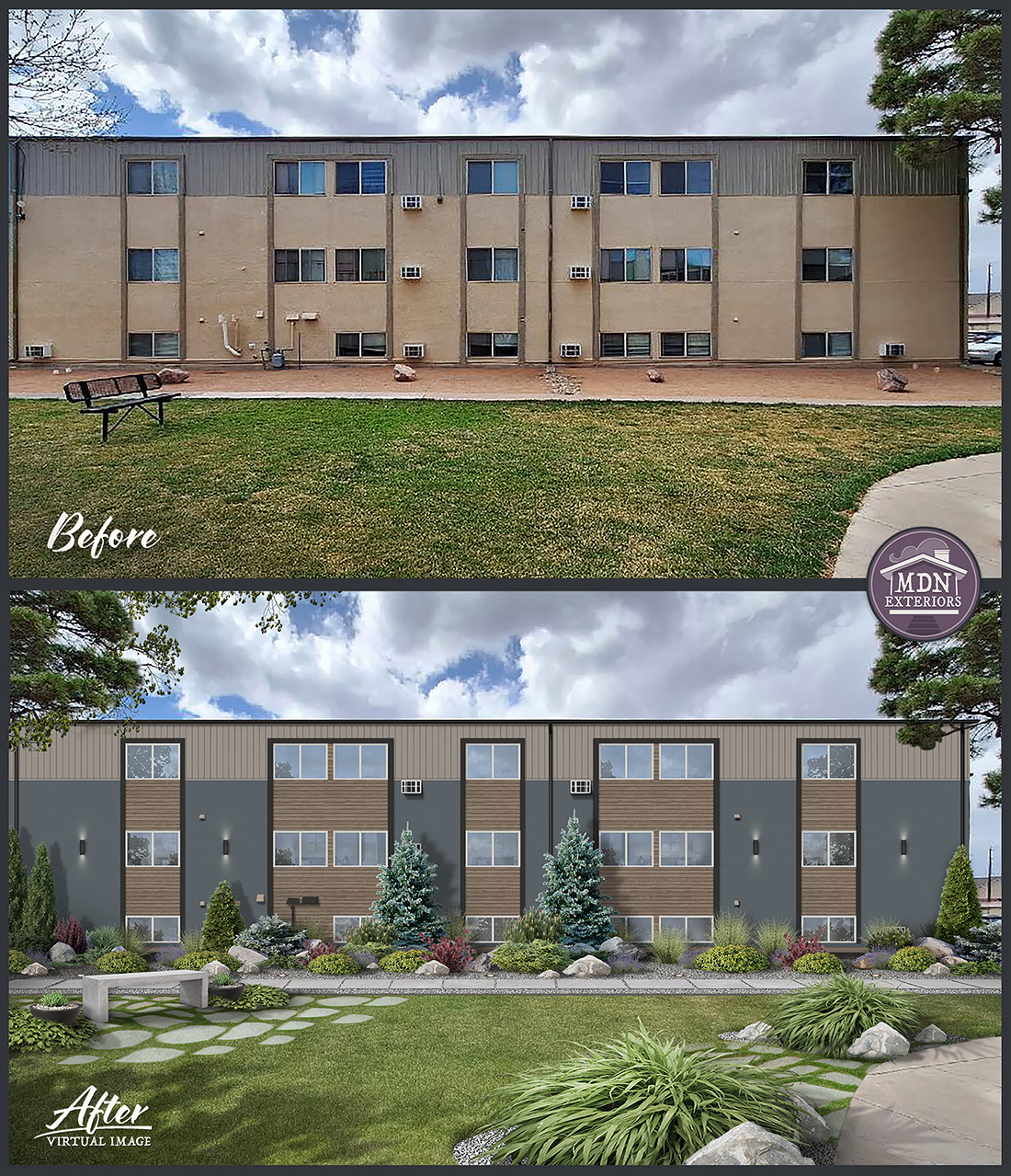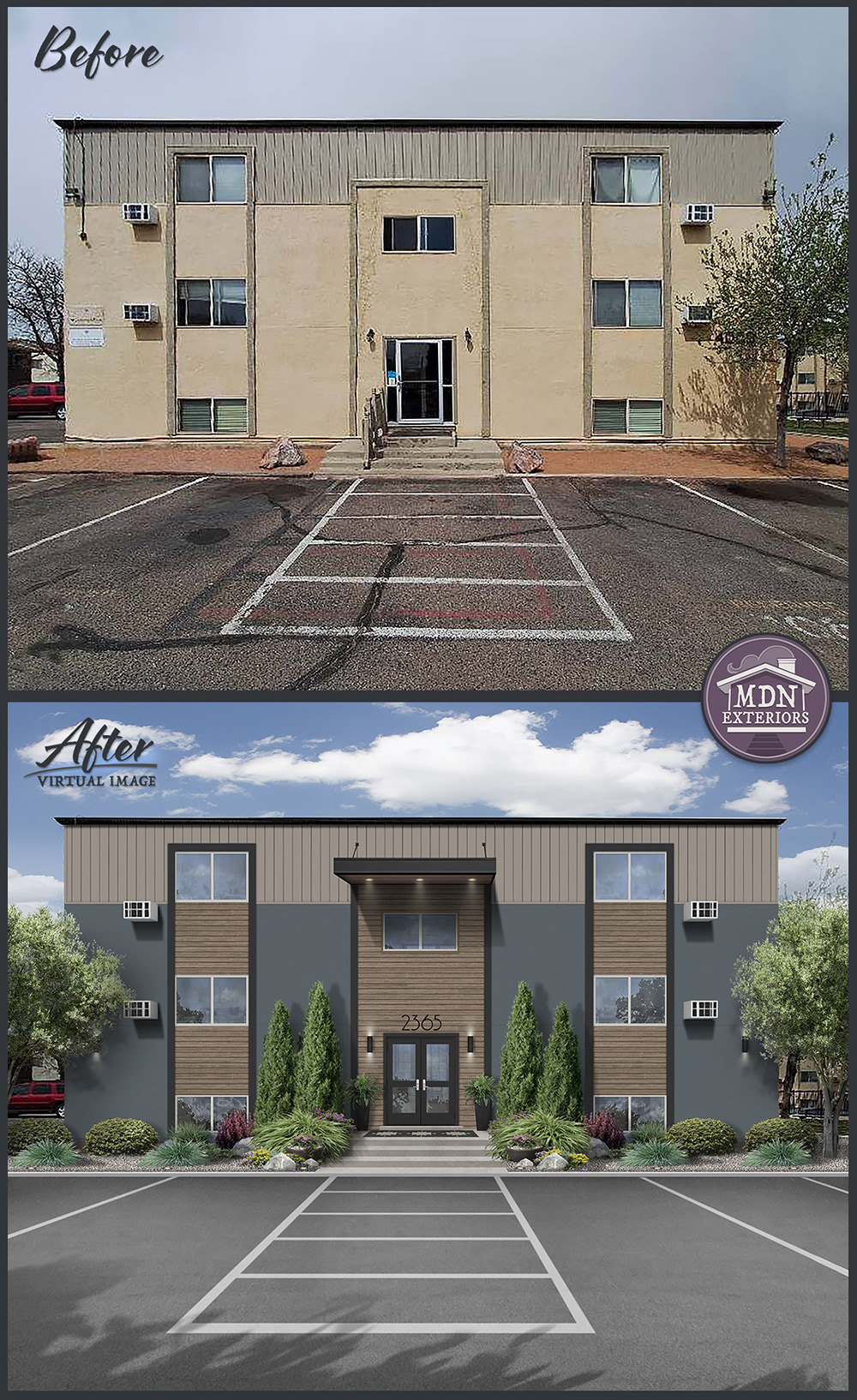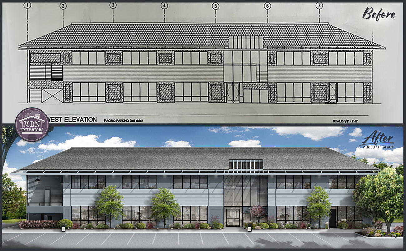 This office’s transformation replaces its tired, utilitarian façade with a bold, contemporary exterior. Rich wood siding and deep blue-gray panels create modern contrast, while vertical accents break up the flat elevation. Sleek black gutters, trim work and a defined entry with canopy lighting enhance the feel of professionalism. New, more colorful landscaping softens the structure and adds curb appeal, making the building look both inviting and high-end.