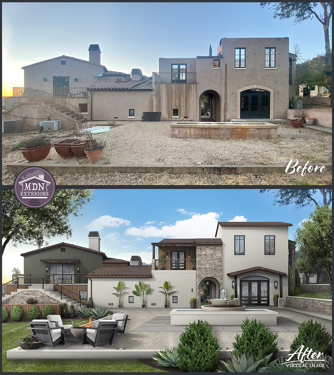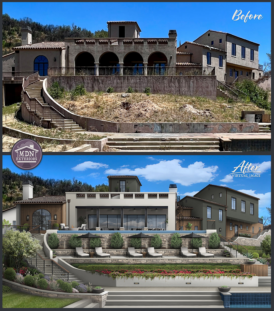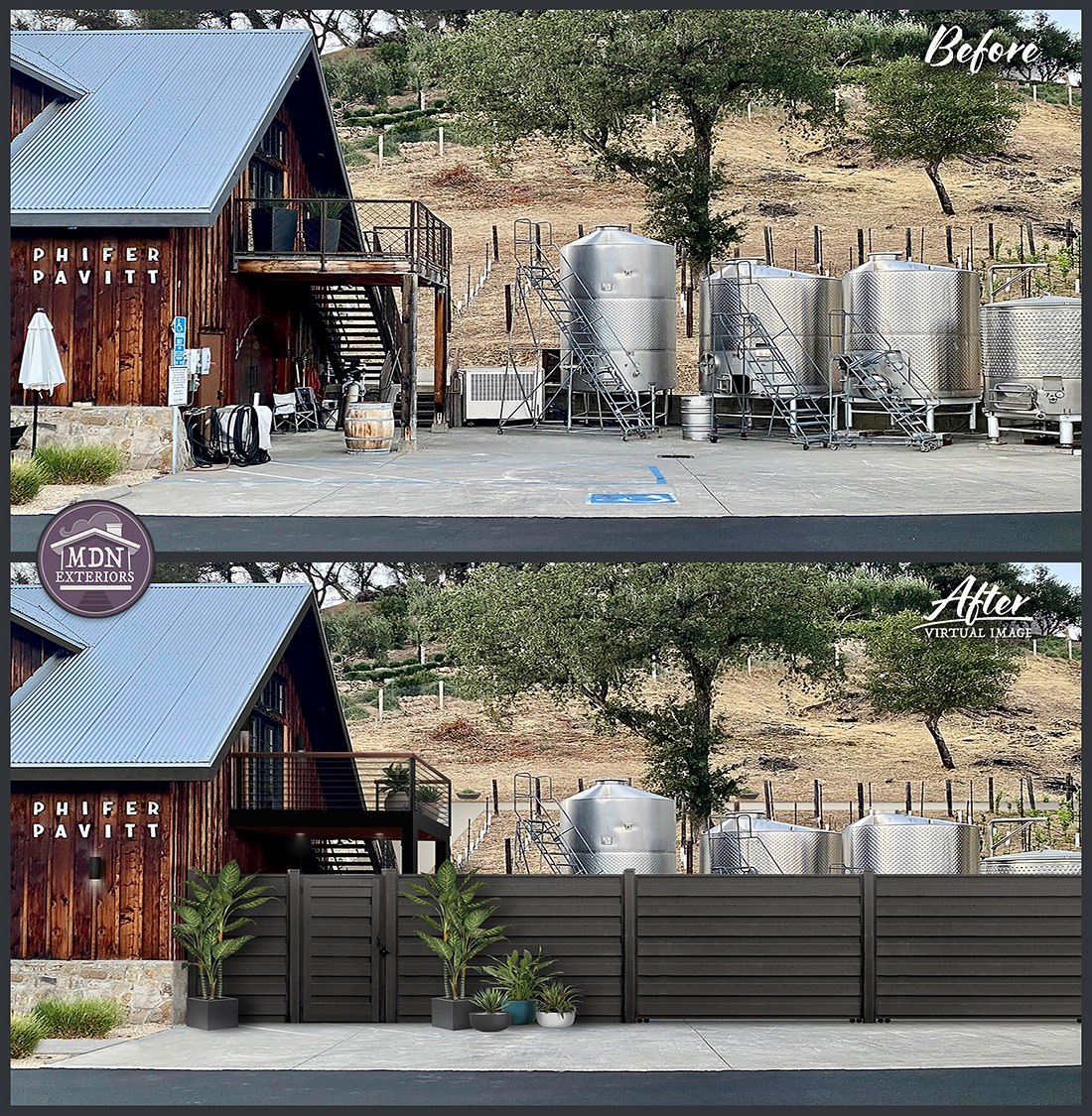 This office’s transformation replaces its tired, utilitarian façade with a bold, contemporary exterior. Rich wood siding and deep blue-gray panels create modern contrast, while vertical accents break up the flat elevation. Sleek black gutters, trim work and a defined entry with canopy lighting enhance the feel of professionalism. New, more colorful landscaping softens the structure and adds curb appeal, making the building look both inviting and high-end.