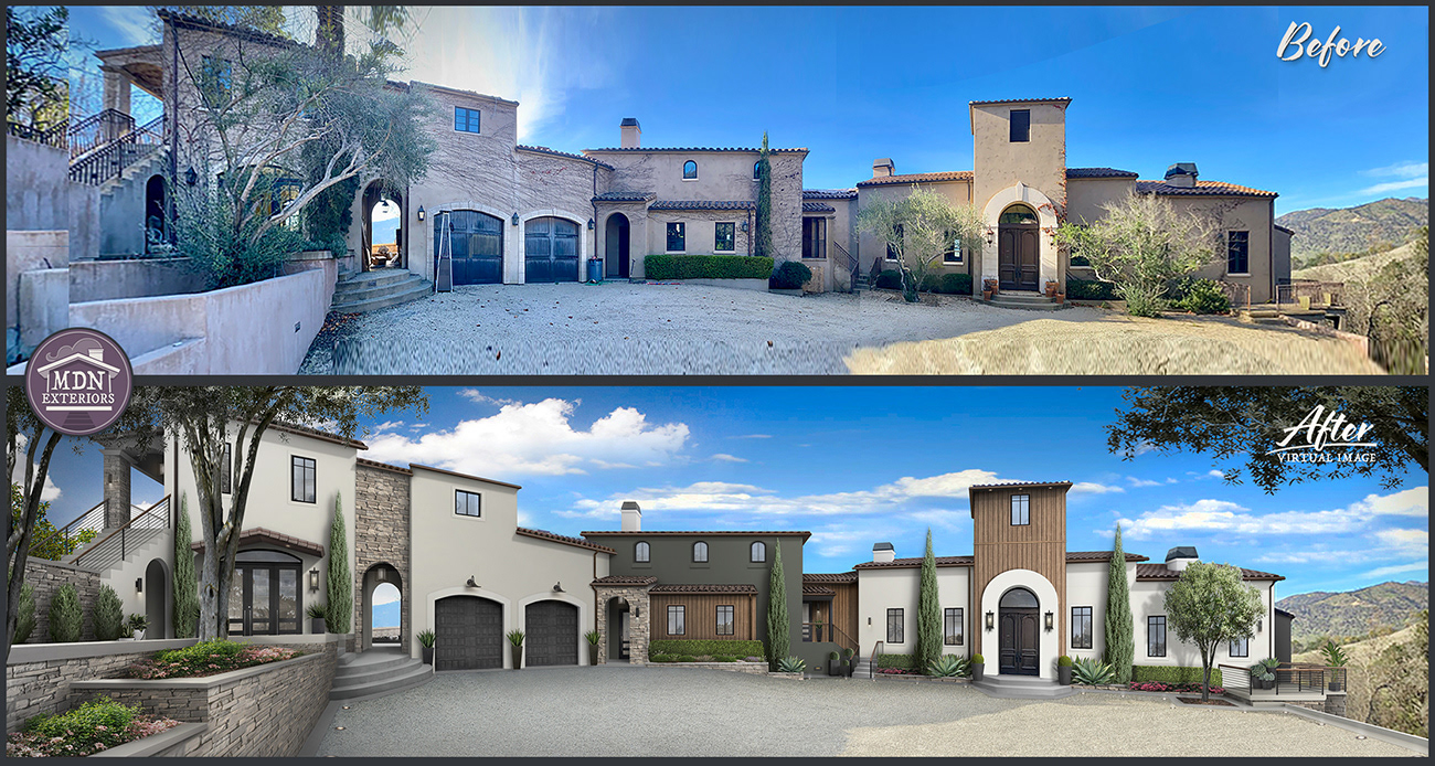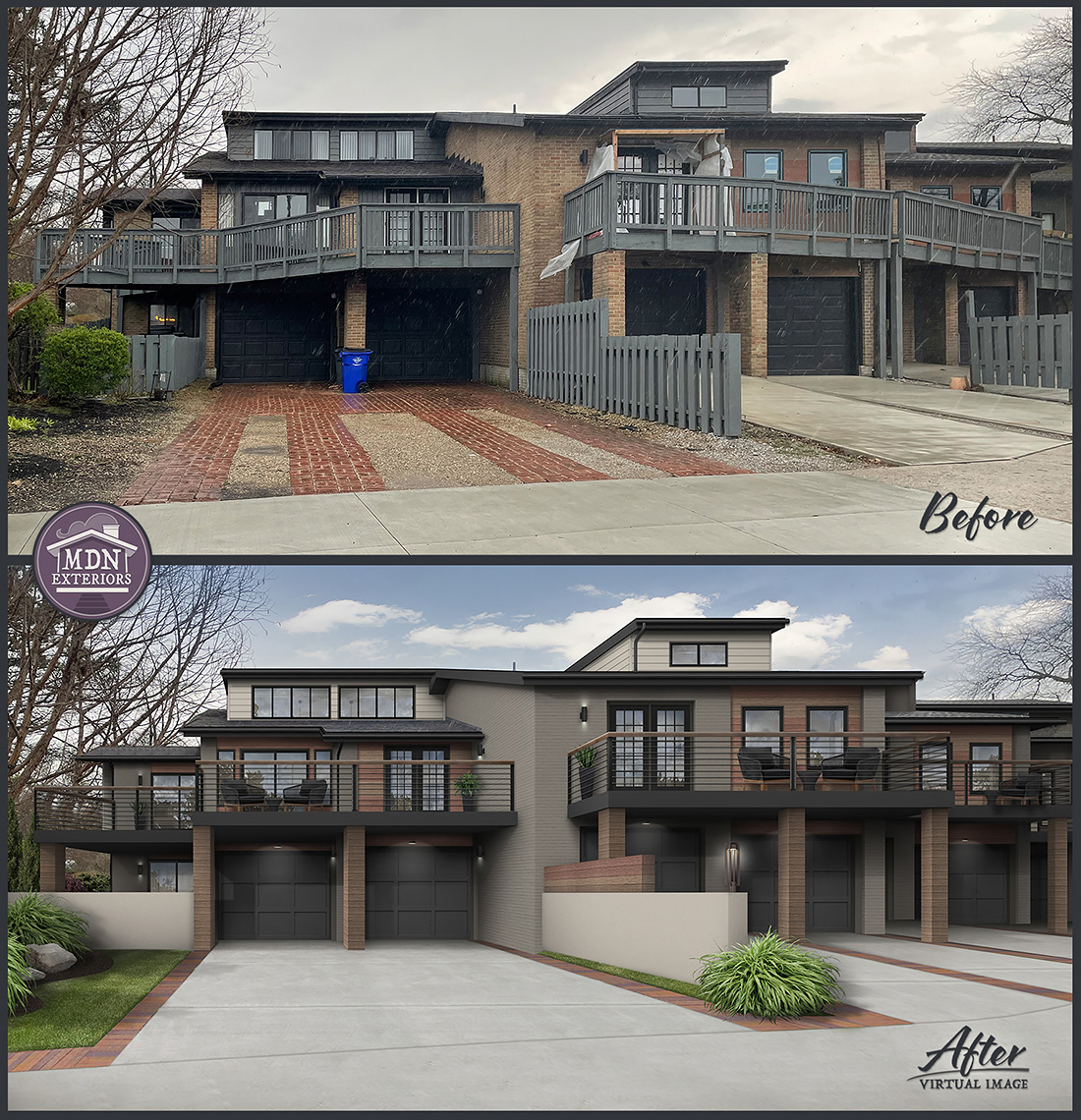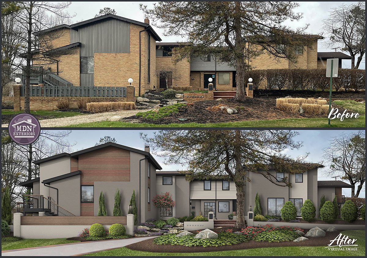 The redesign highlights contemporary elegance through cream-toned stucco, warm brown brick, distinctive wood accents, and bold black detailing. Clean lines, modern balconies with cable railing, and sleek lighting elevate the architecture, while reimagined entryways add a polished, upscale feel. Lush landscaping with structured greenery and vibrant color softens the façade, enhancing warmth and curb appeal.
