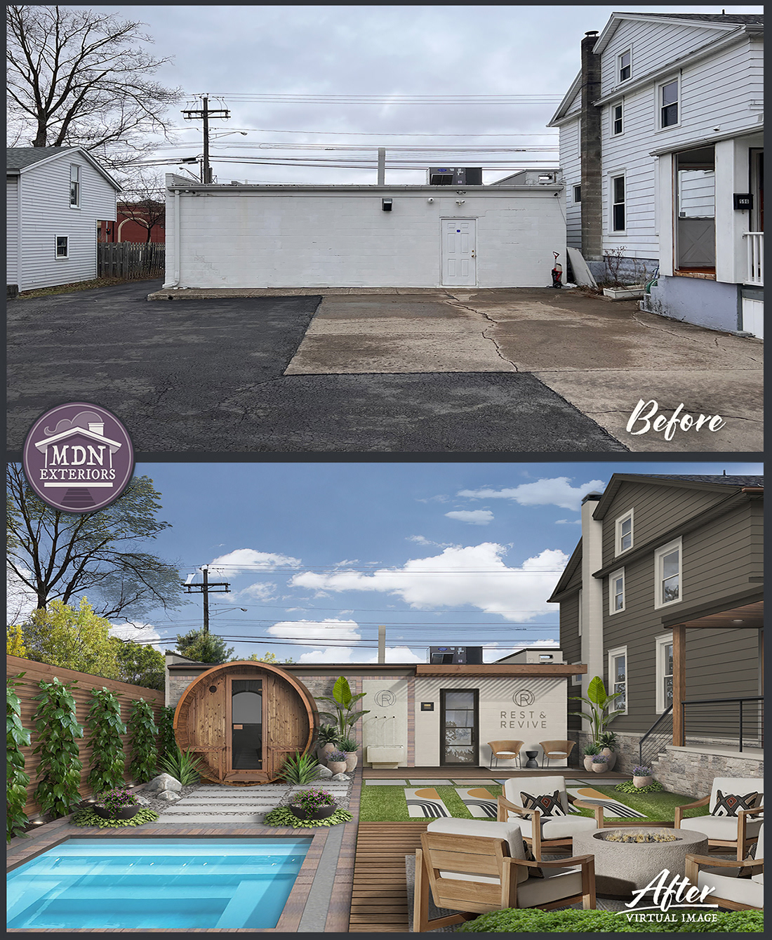 What was once a parking lot has been reimagined into an urban day-spa retreat. This modern oasis is complete with a sleek plunge pool, wood decking, and a circular cedar sauna. Vertical greenery, layered landscaping, and natural stone details soften the hardscape, while a cozy fire pit lounge and stylish outdoor seating create a relaxing atmosphere. The design blends clean lines with organic textures, turning an underused lot into a functional, resort-inspired sanctuary.
