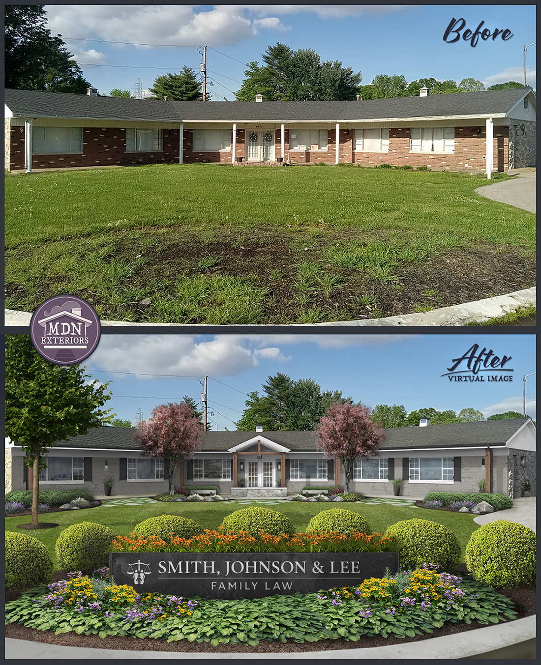 An vision that showcases a soft, neutral palette of painted brick and clean trim, complemented by a refreshed entry with wood accents and stone details. Lush landscaping with layered greenery, flowering plants, and ornamental trees frames the property, while a stylish monument sign engraved with the firm’s name adds sophistication and creates an inviting frontage that conveys trust and credibility.