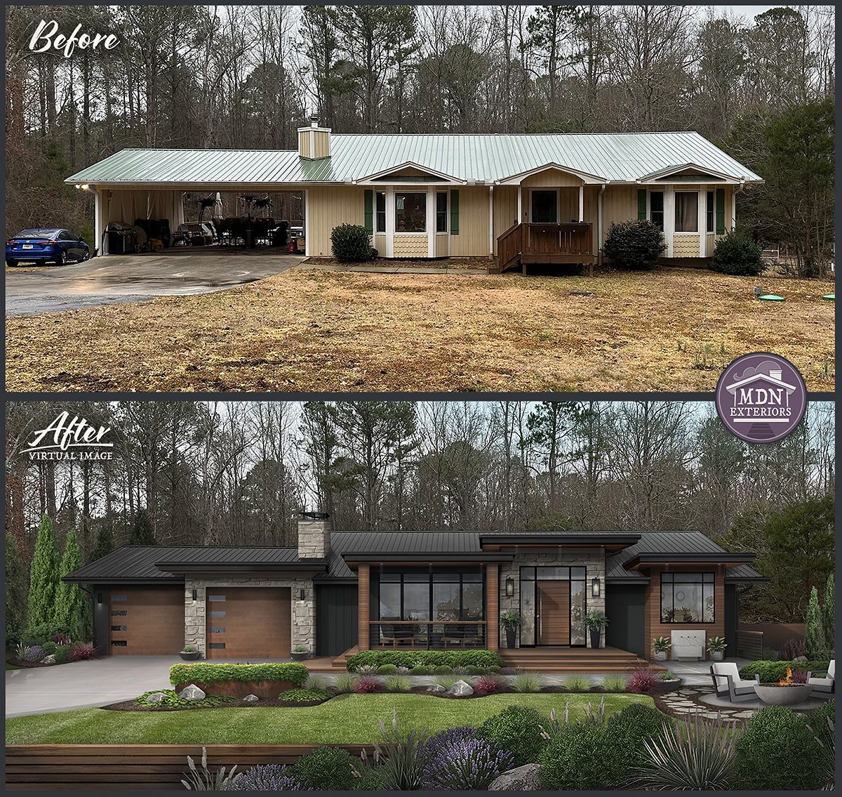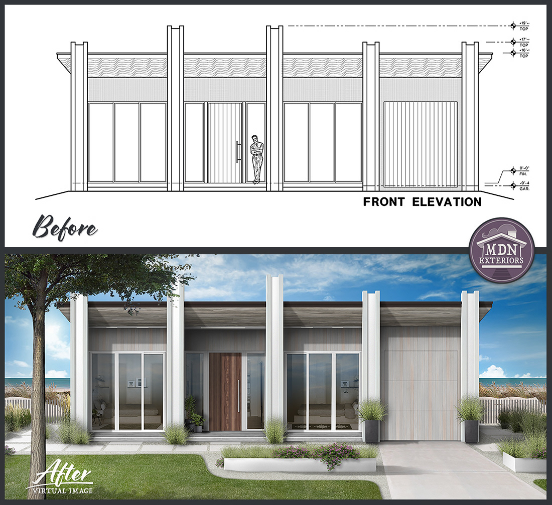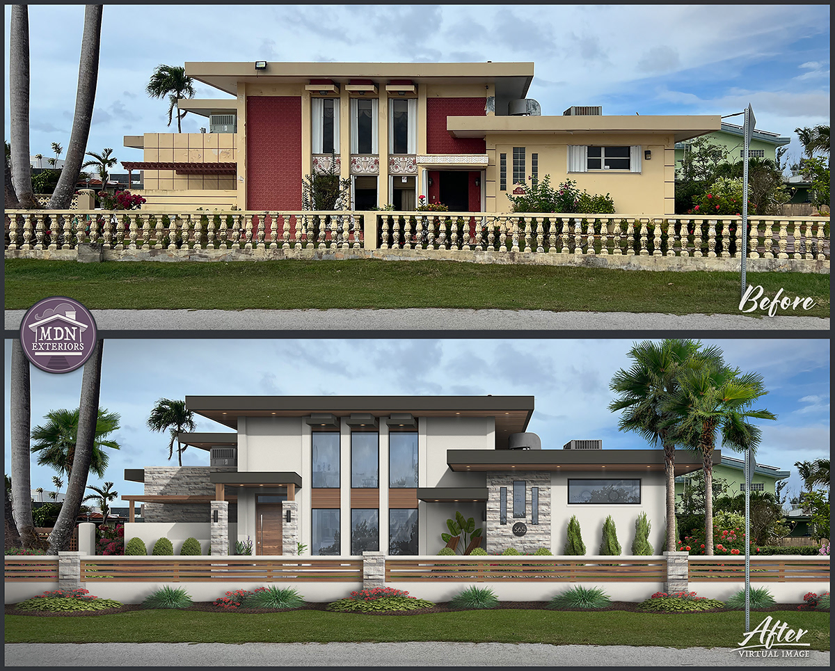 A Contemporary design that highlights clean geometry and material contrast. Smooth off-white stucco pairs with warm wood accents, soffits and stacked stone, adding depth and texture. Tall vertical windows framed in dark trim invite light, while flat rooflines with deep overhangs reinforce the modern aesthetic. A streamlined stucco-and-wood fence with stone columns completes the cohesive façade.