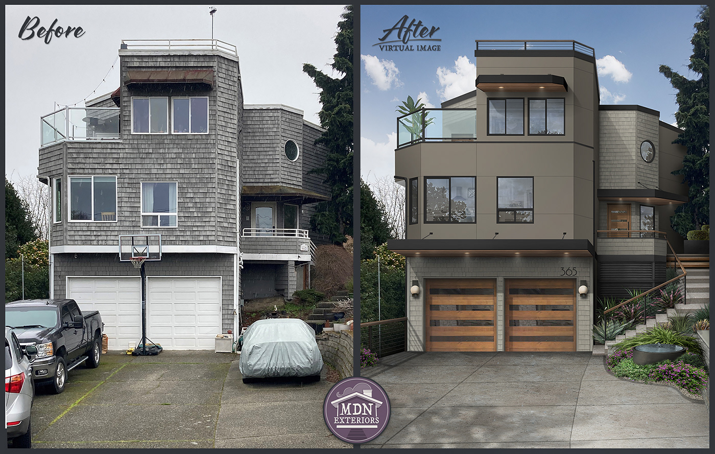 Modern Contemporary style is showcased in this house design with clean lines, geometric forms, and mixed materials. Smooth brown panels, gray shingle siding, and wood garage doors create warmth, while large black-framed windows, glass railings, and a rooftop deck emphasize its sleek, urban feel.