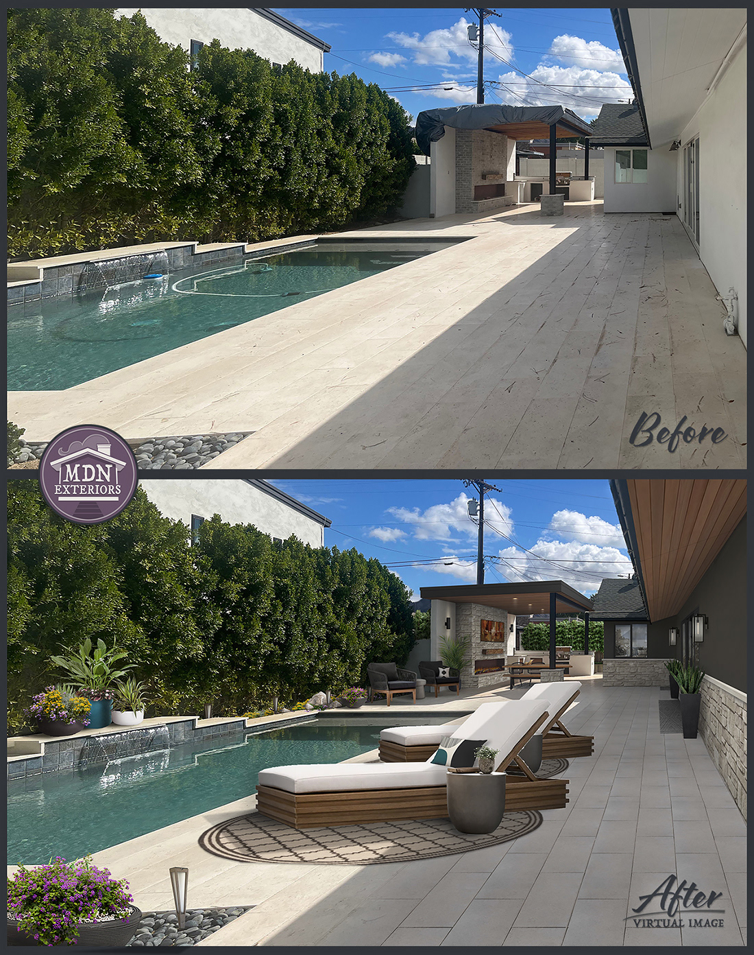 An outdoor space that reflects a Modern Resort aesthetic. Smooth stone pavers extend across the pool deck, complemented by a dark-tile water feature for contrast and movement. Stacked-stone accents at the home’s base add texture, while wood-framed loungers and a covered pavilion with a stone fireplace create a warm, contemporary retreat.