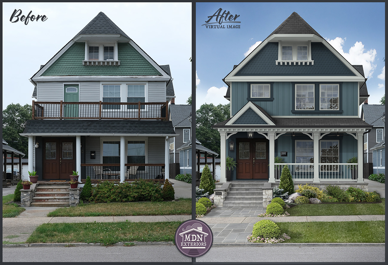 This home showcases a charming blend of Victorian design with Craftsman nuances - with a steep gabled roof, wide front porch, and ornate columns; its deep, two-toned blue siding with white trim and gray shingle roof create a bold yet inviting look, while the warm wood double doors and neatly landscaped entryway add a touch of classic elegance.