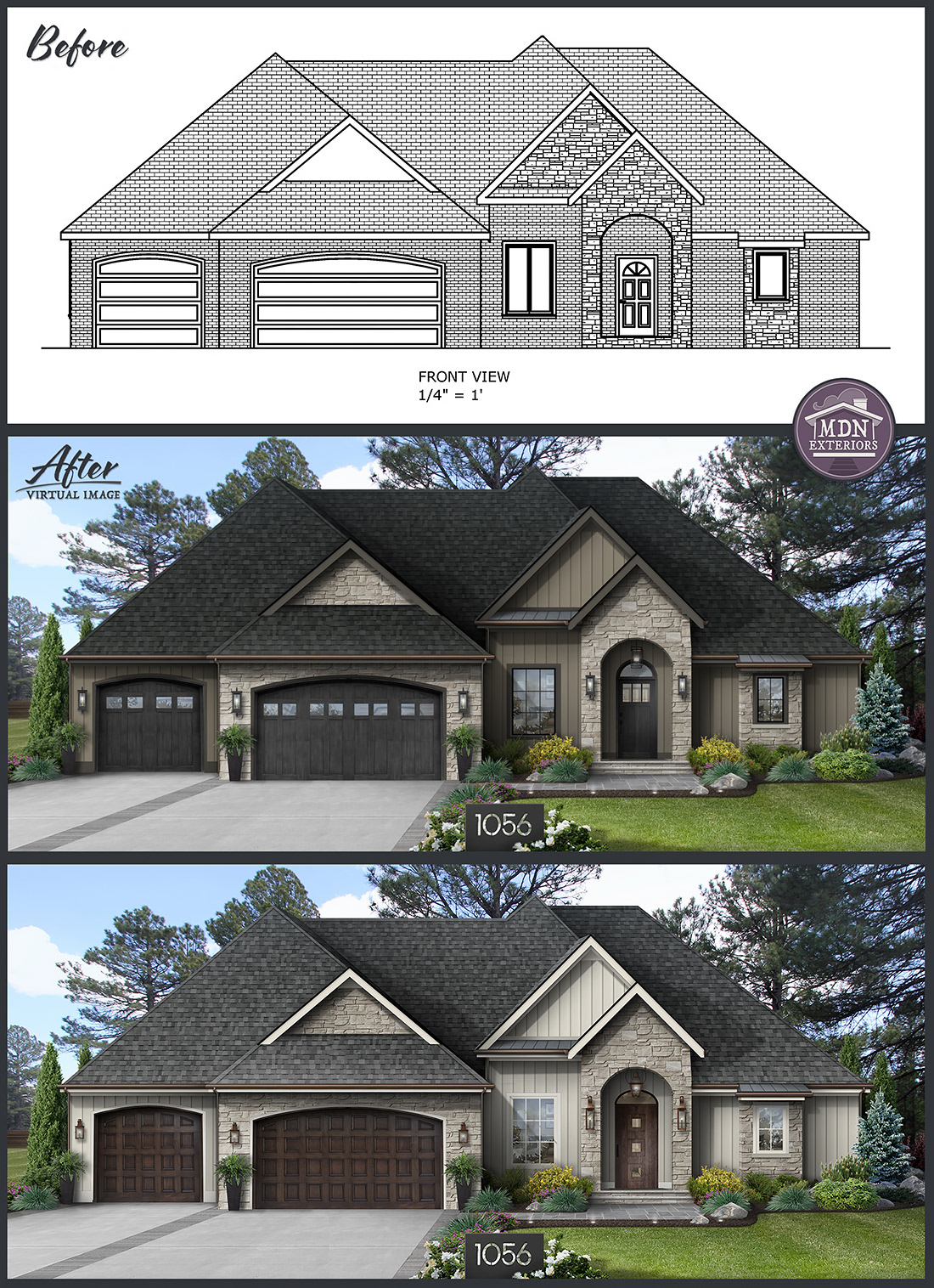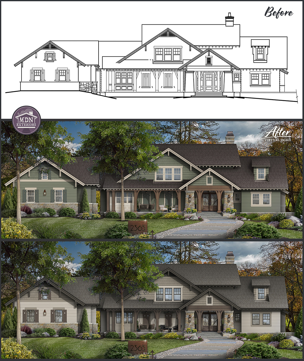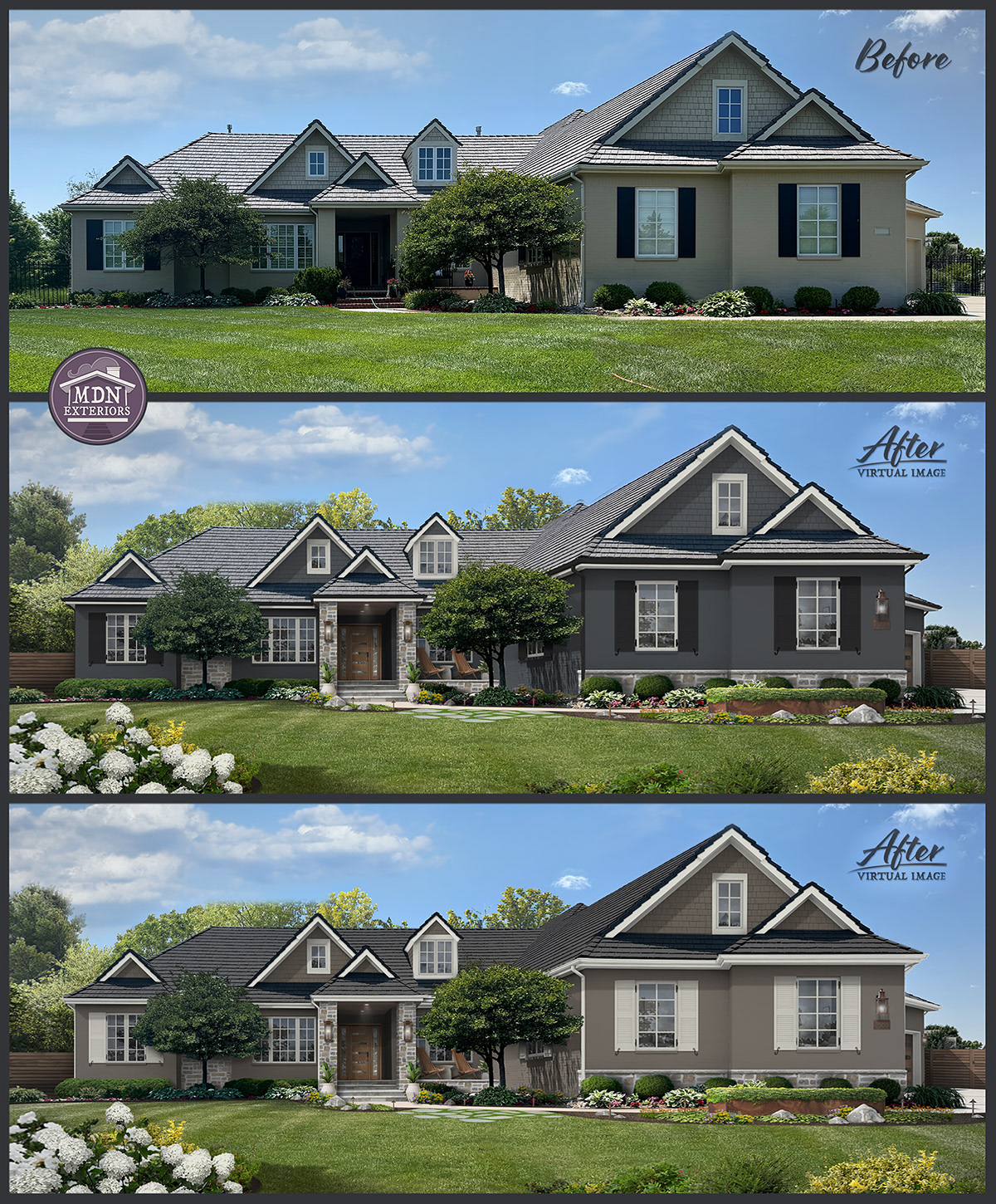 In a softer taupe and gray palette, this version takes on a refined, elegant character. The muted tones enhance the stonework and timber accents, while the darker roof and trim provide balance, creating a timeless look.