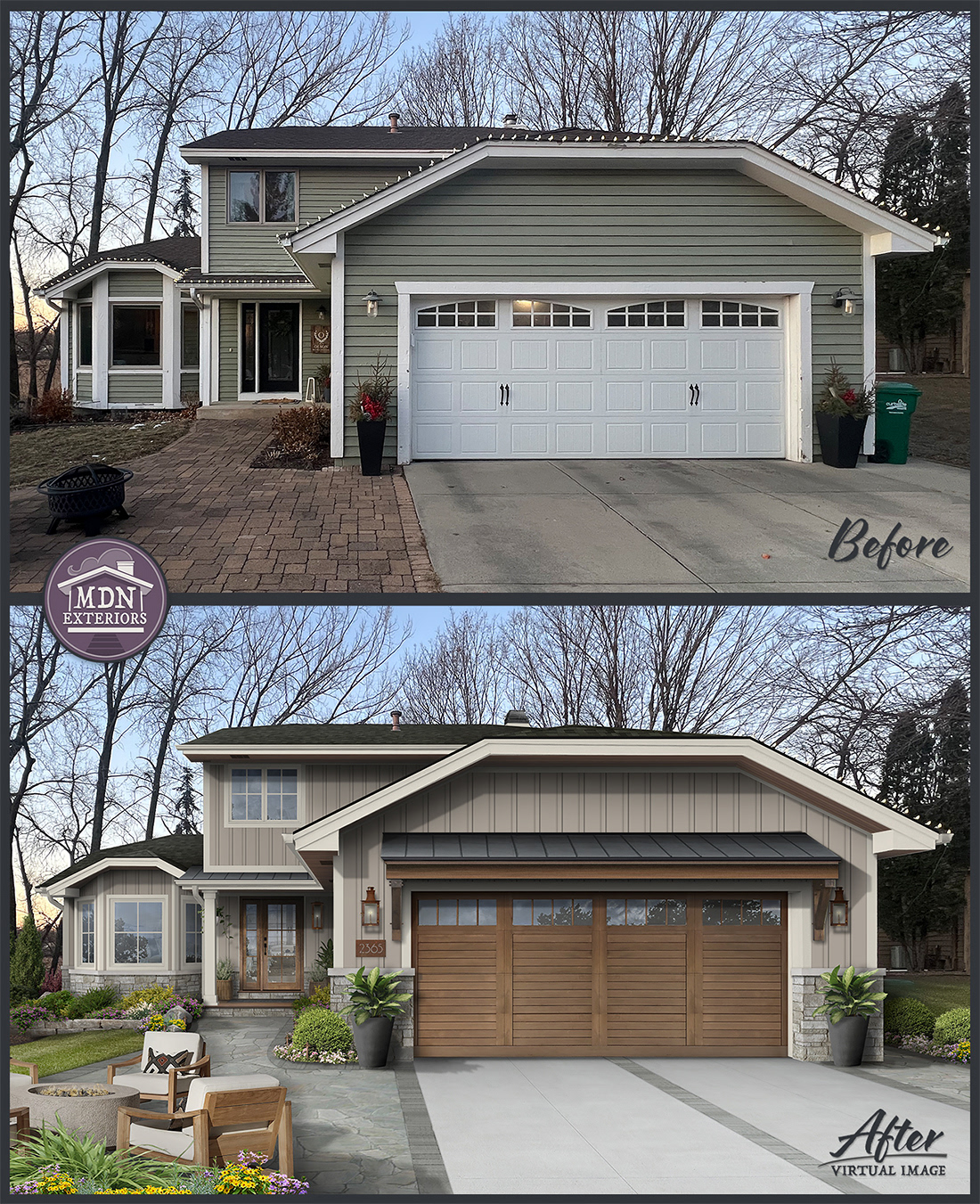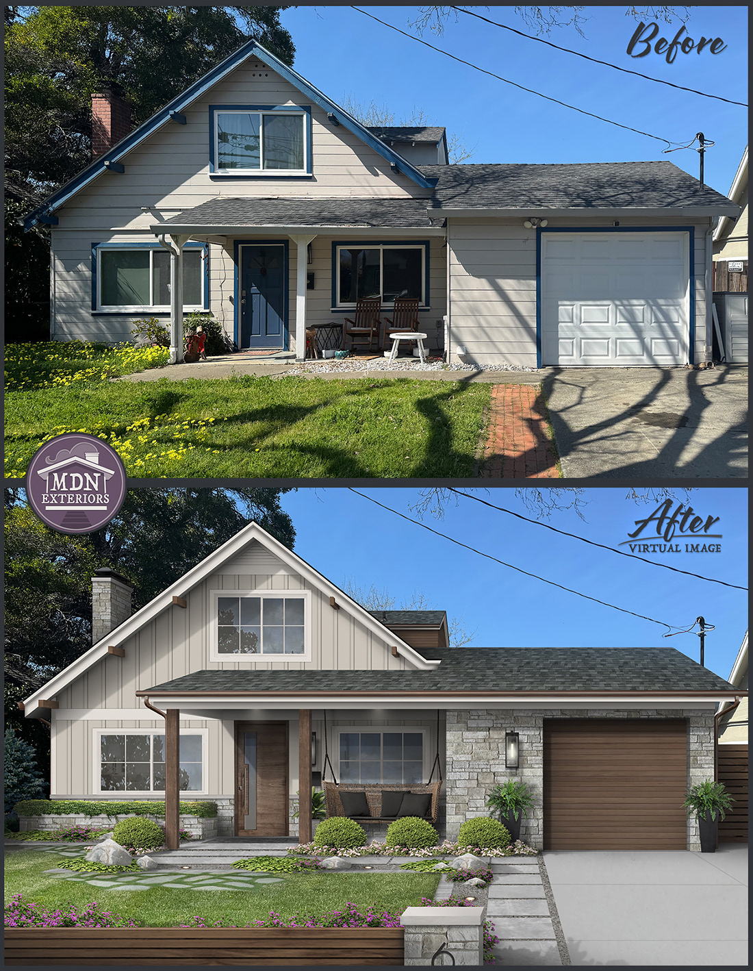 This design highlights a softer palette with warm, creamy board-and-batten siding, natural stone accents, and rich wood doors. Crisp trim defines the gables and windows, while copper lighting balances the design with warmth and elegance.