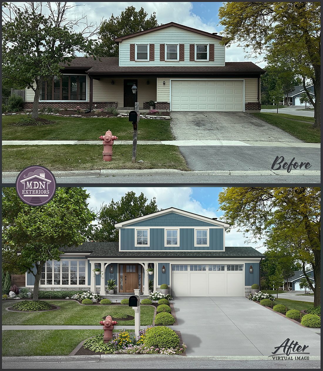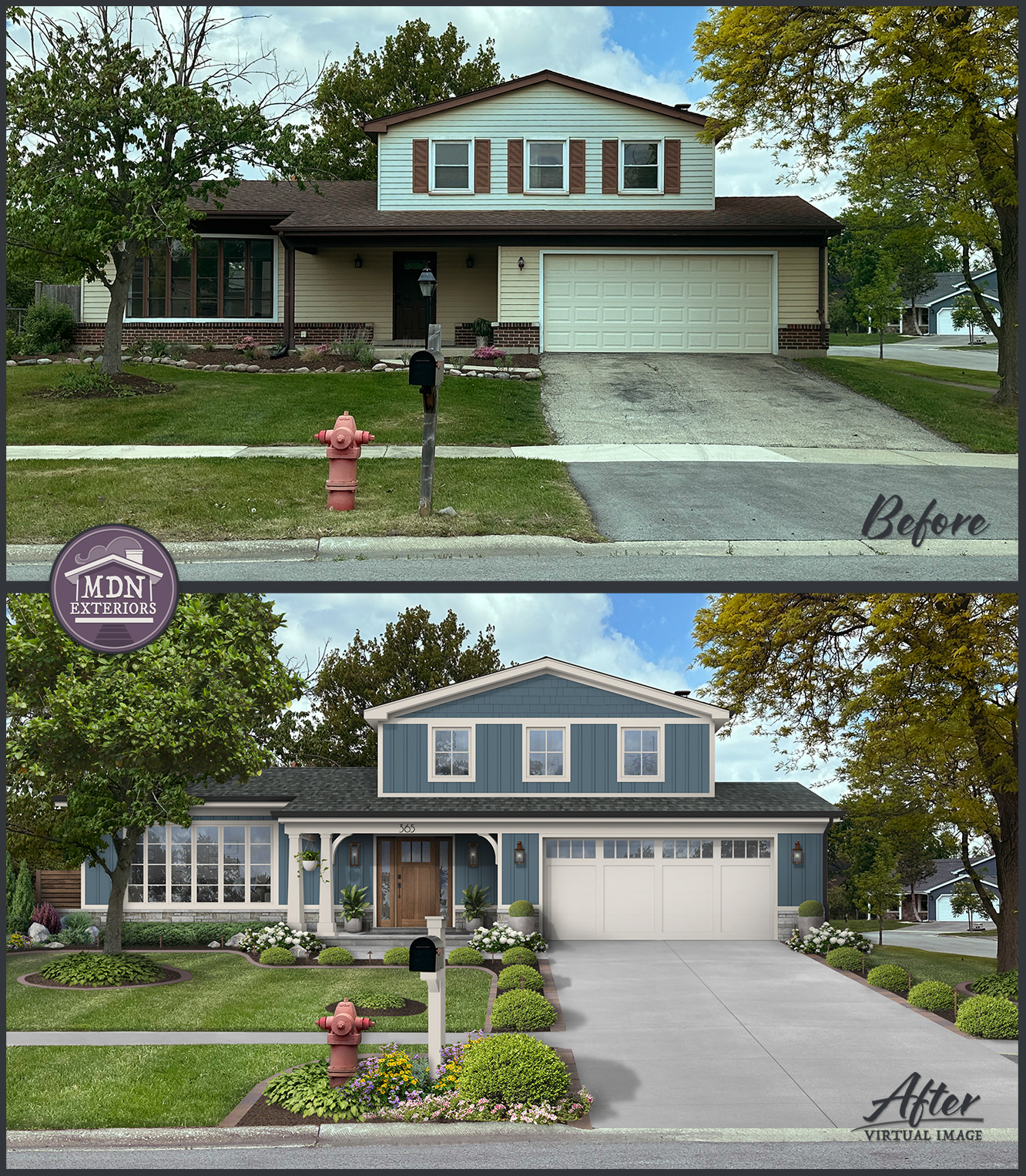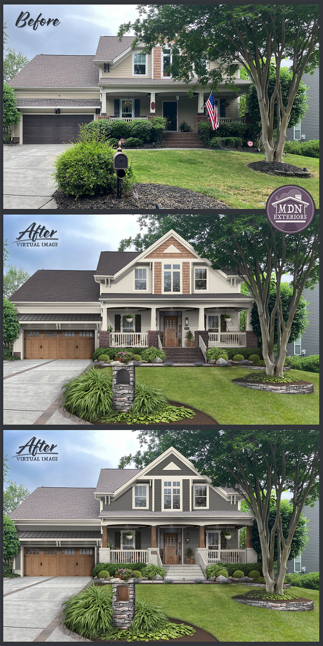 With its softer taupe siding and creamy shutters, this Transitional Craftsman home feels warm and welcoming. The lighter palette enhances the stone and shingle details, striking a perfect balance of traditional charm and modern refinement.