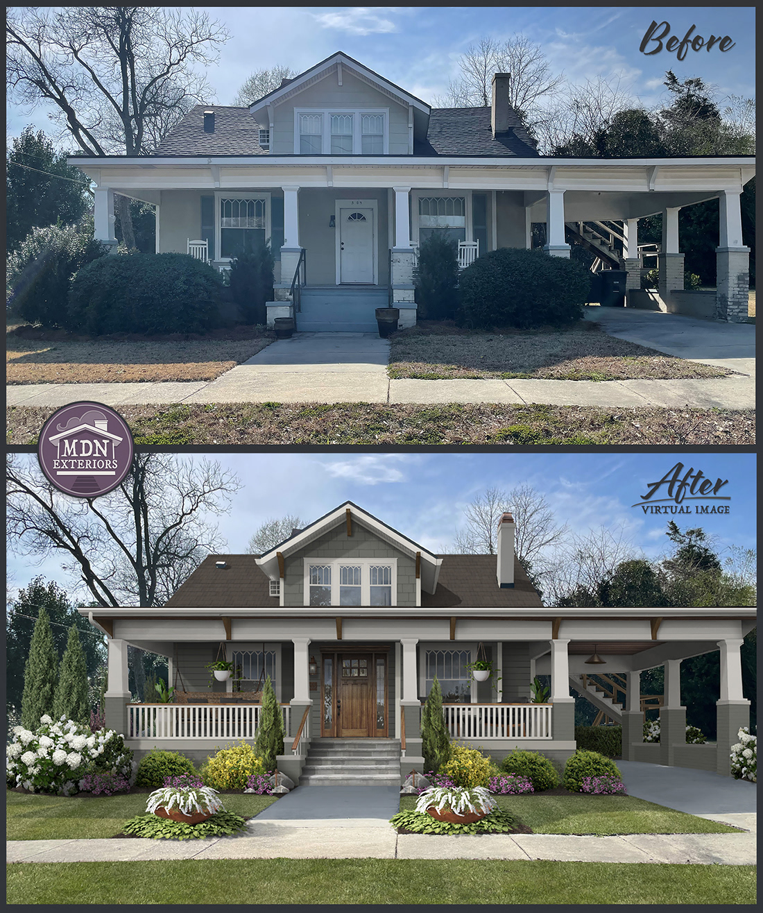 In this design, rich gray siding, a natural wood front door, and white trim restore the home’s historic charm. The wide front porch is framed with sturdy brick-based columns, accented by decorative, wooden rafters, new railings and stone steps turning the home into a warm and inviting Craftsman showcase