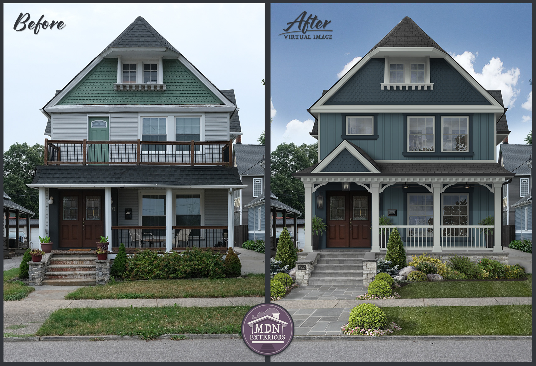 In this design, rich gray siding, a natural wood front door, and white trim restore the home’s historic charm. The wide front porch is framed with sturdy brick-based columns, accented by decorative, wooden rafters, new railings and stone steps turning the home into a warm and inviting Craftsman showcase