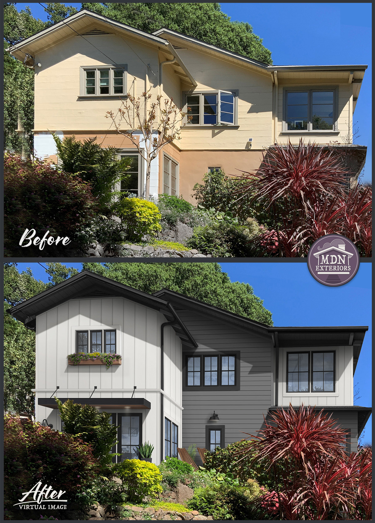 A contemporary take on the Modern Farmhouse style, this design pairs crisp vertical board-and-batten siding with contrasting horizontal lap siding for layered texture. Dark-framed windows and exposed eaves introduce a modern edge, while natural wood accents and flower boxes soften the overall look.