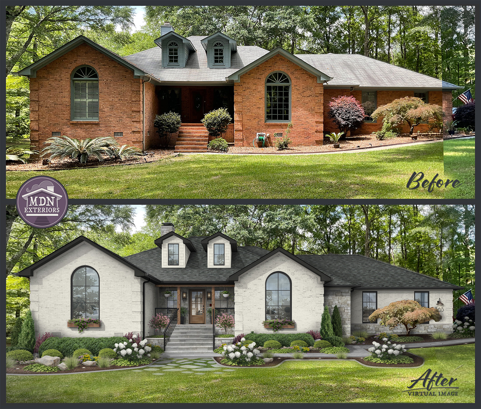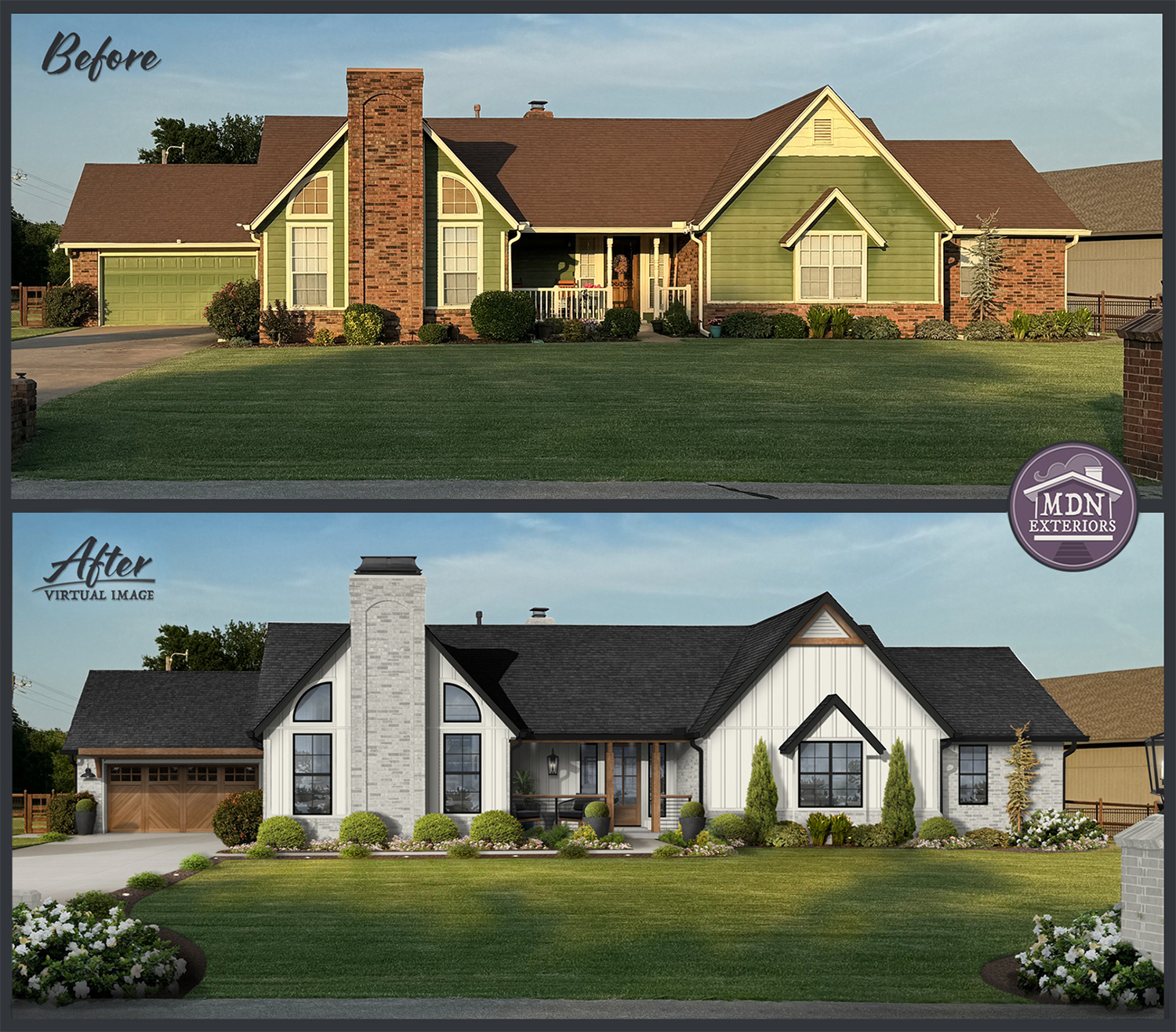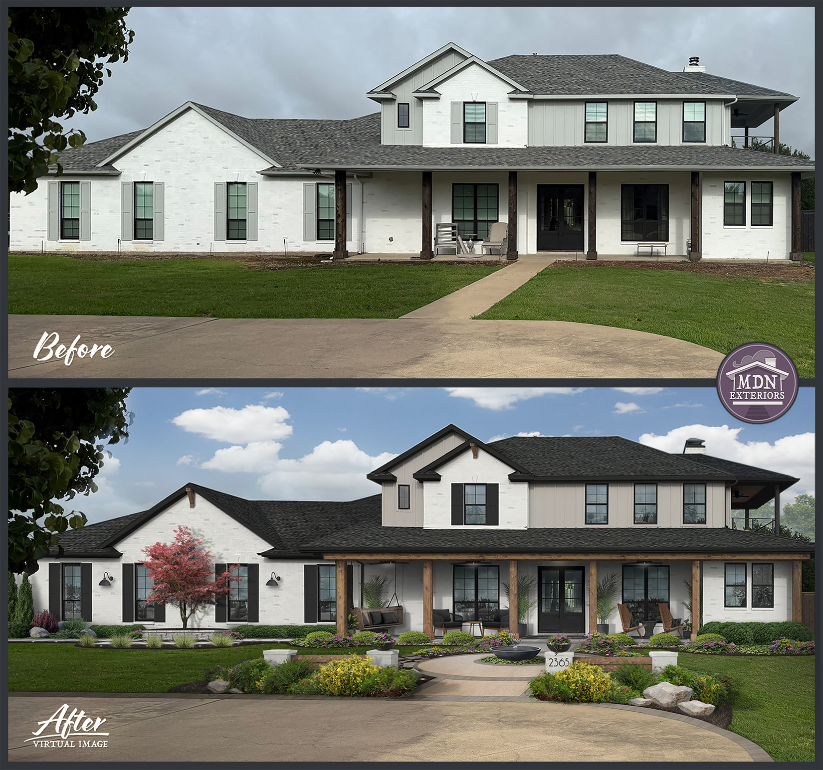 This Modern Farmhouse exterior design features painted white brick accented by vertical board-and-batten siding, adding depth and texture. Black-framed windows and shutters provide contrast, while natural wood posts along the deep porch add an organic touch. A charcoal shingle roof ties the composition together, complemented by black gooseneck lighting that reinforces the farmhouse character.
