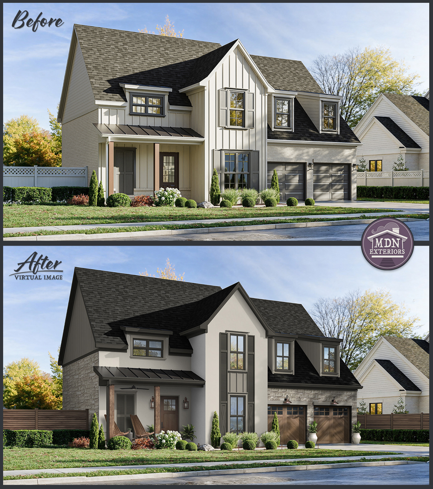 A Transitional Modern Farmhouse design that blends rustic warmth with clean contemporary lines. Smooth stucco walls are paired with stone accents, while board-and-batten siding introduces texture and depth. Dark window trim and shutters provide contrast, complemented by a black metal porch roof supported by wood posts that bring a natural, rustic touch. The warm wood garage doors ground the façade, balancing modern simplicity with farmhouse charm for a welcoming curb appeal.