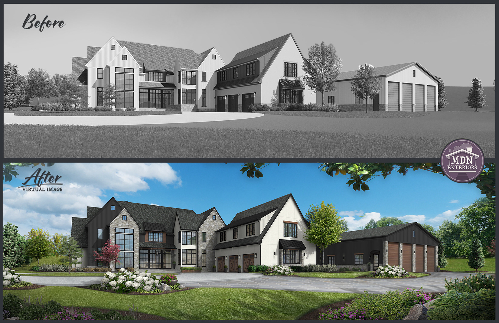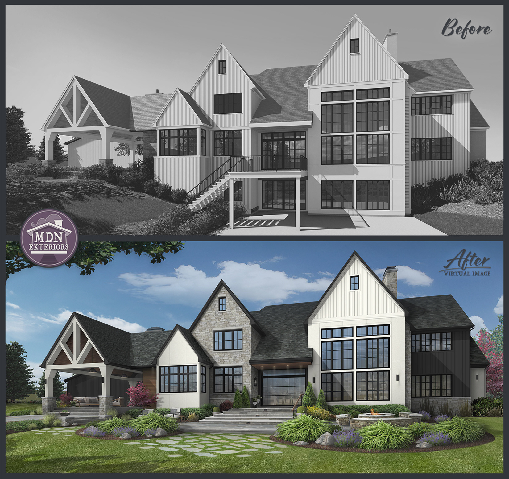 A blend of classic farmhouse warmth and modern simplicity - utilizing gabled forms, clean lines, and a mix of wood, stone, and metal accents to create a timeless yet contemporary aesthetic.