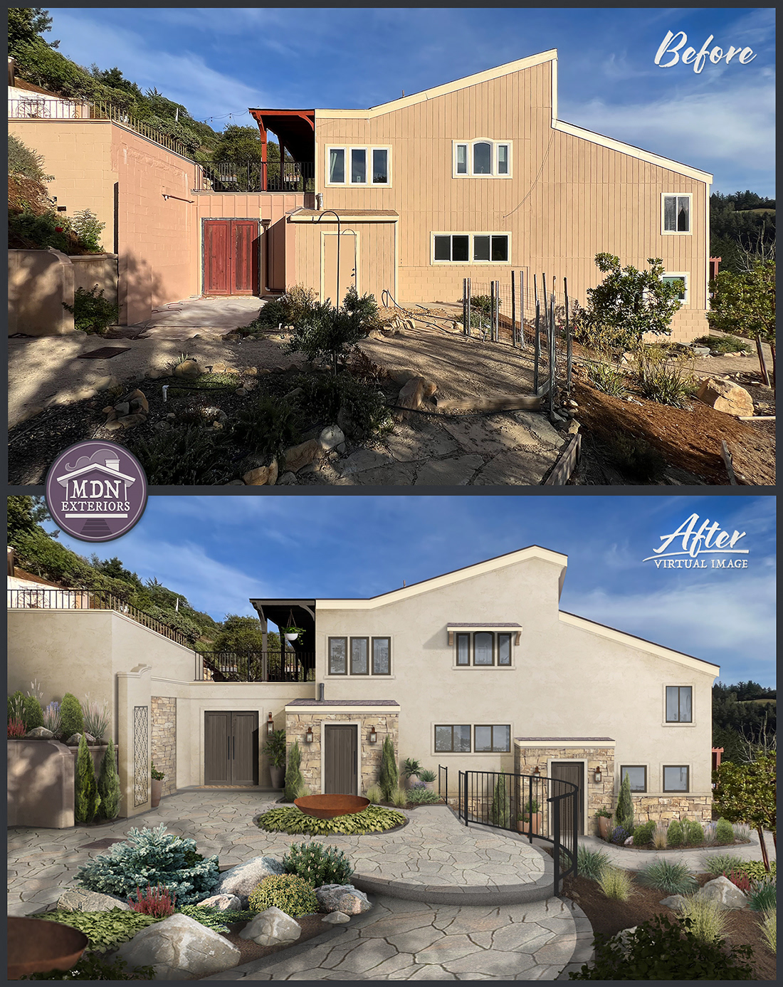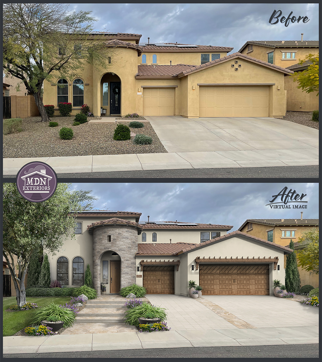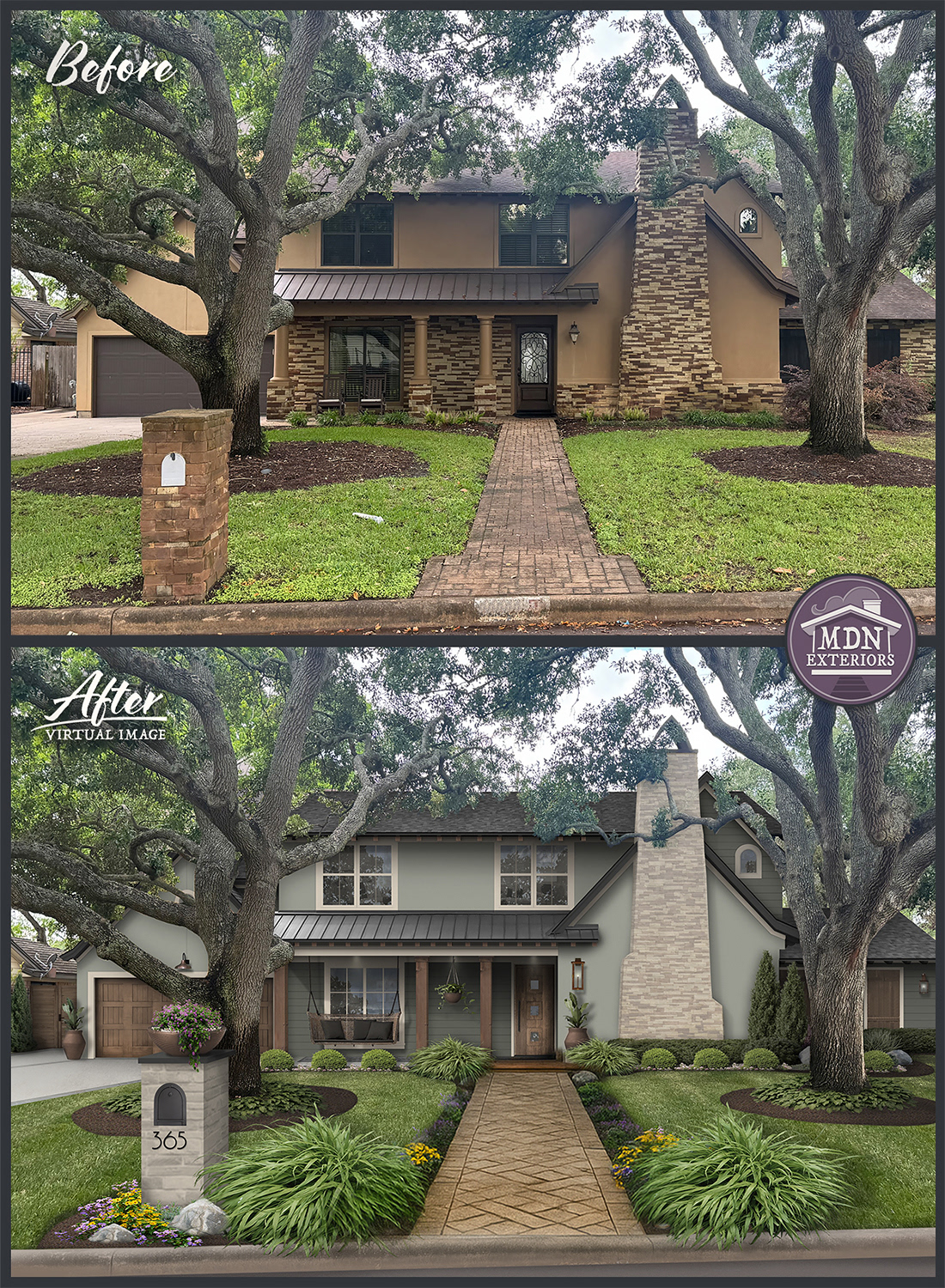 A redesign that channels Mediterranean style through warm, tactile materials and balanced detailing. A patterned stone walkway and rustic wood accents pair with a creamy brick chimney, while terracotta planters and copper lantern fixtures complete the look.