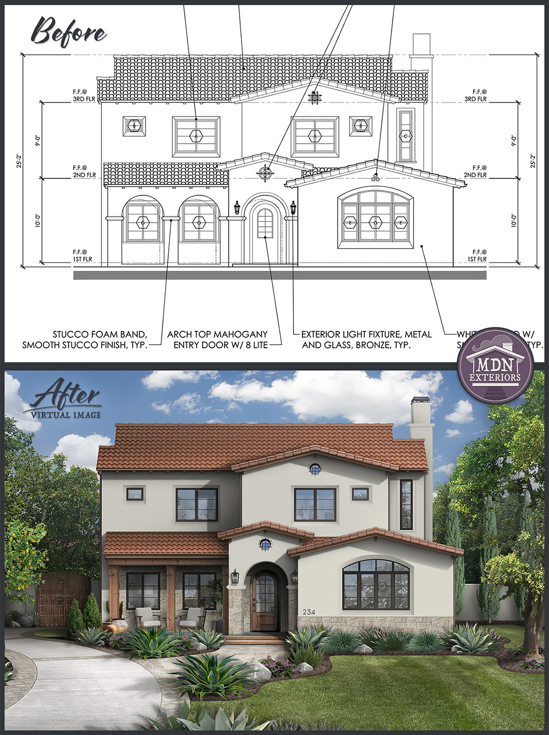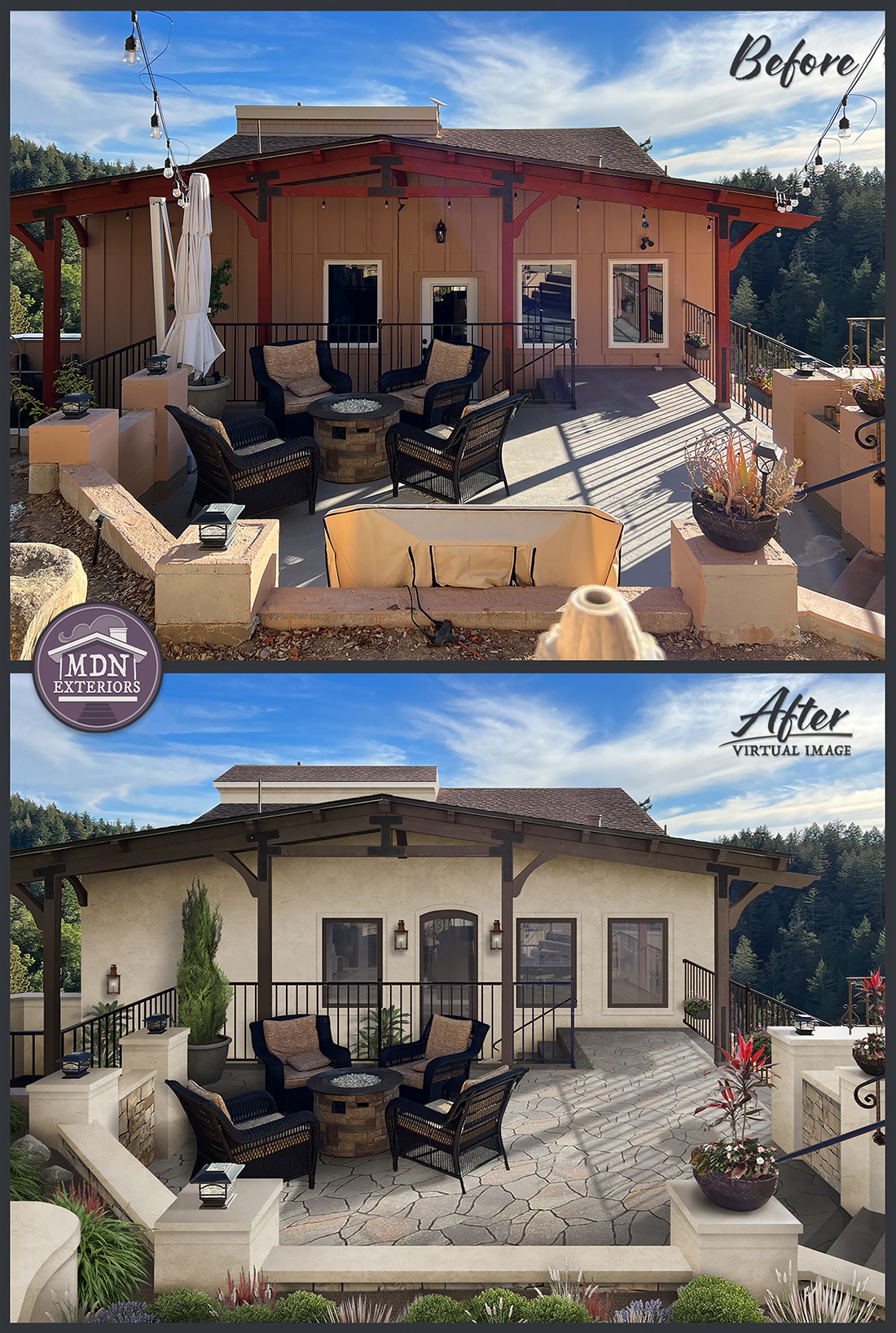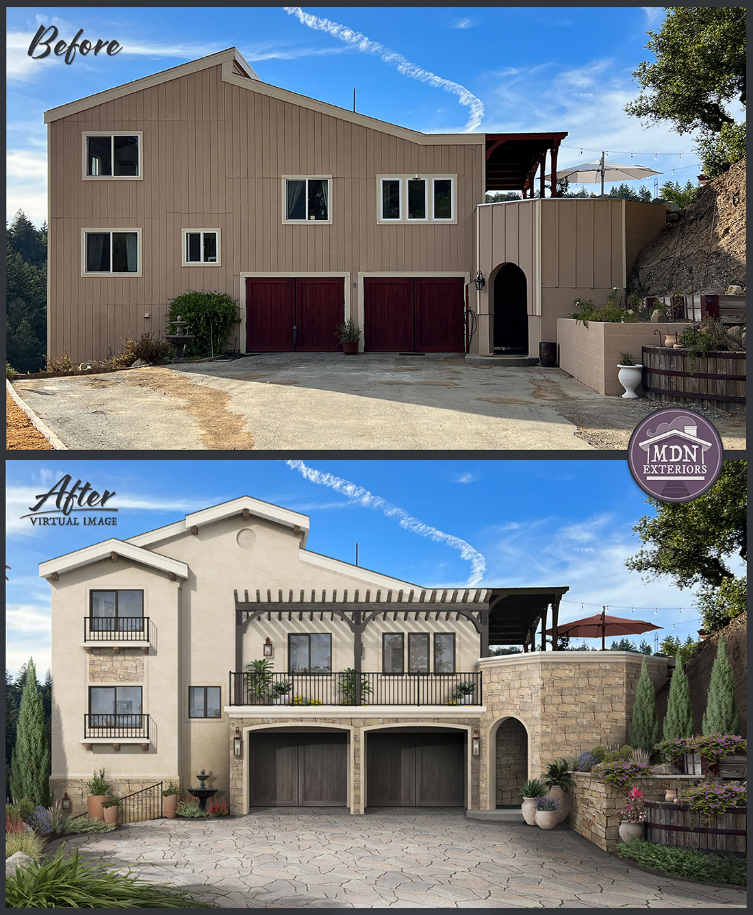 A redesign that channels Mediterranean style through warm, tactile materials and balanced detailing. A patterned stone walkway and rustic wood accents pair with a creamy brick chimney, while terracotta planters and copper lantern fixtures complete the look.
