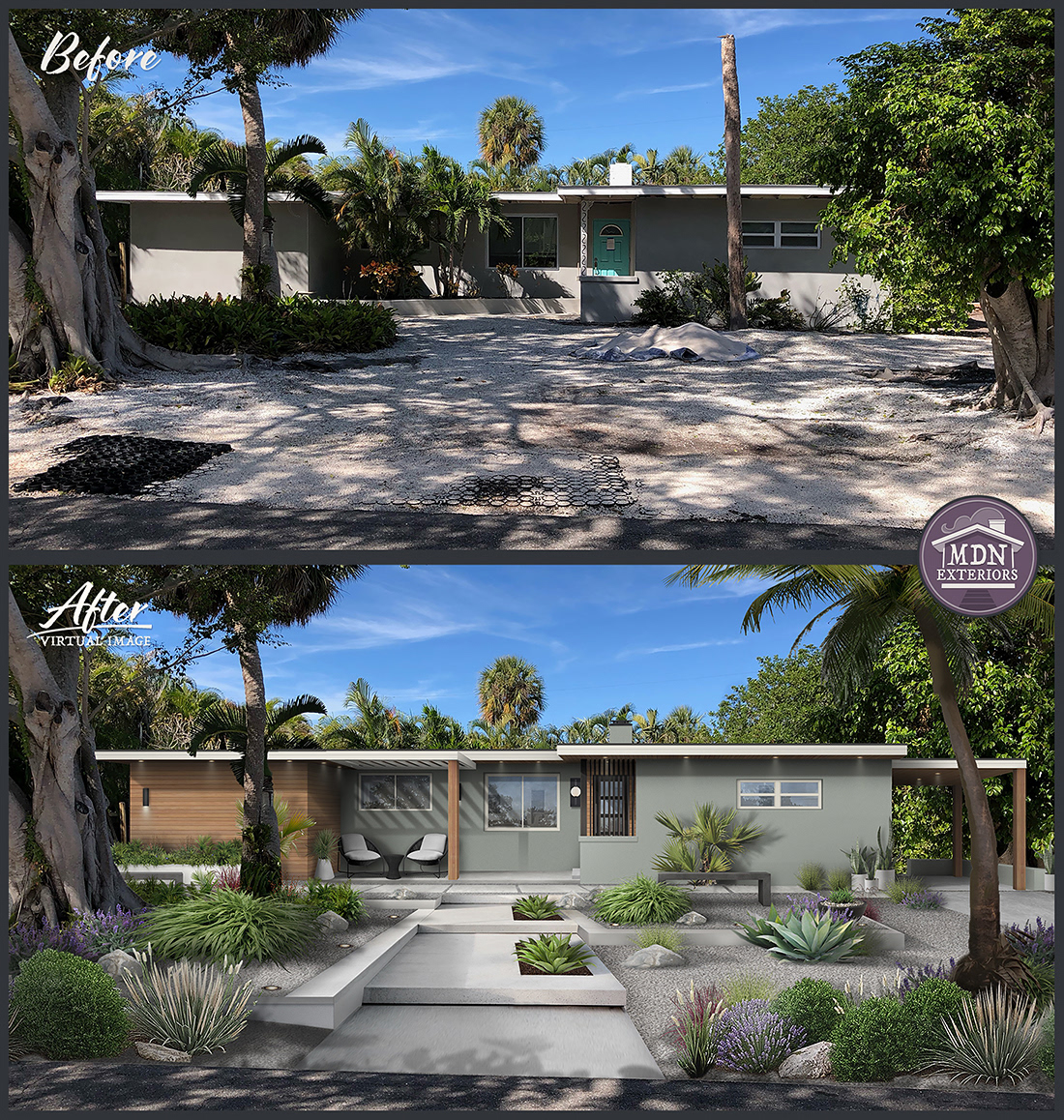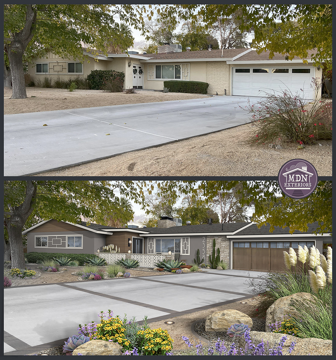 Mid-Century Modern exteriors feature clean horizontal lines, expansive windows, and a mix of natural and modern materials, creating open, visually connected architecture and design.