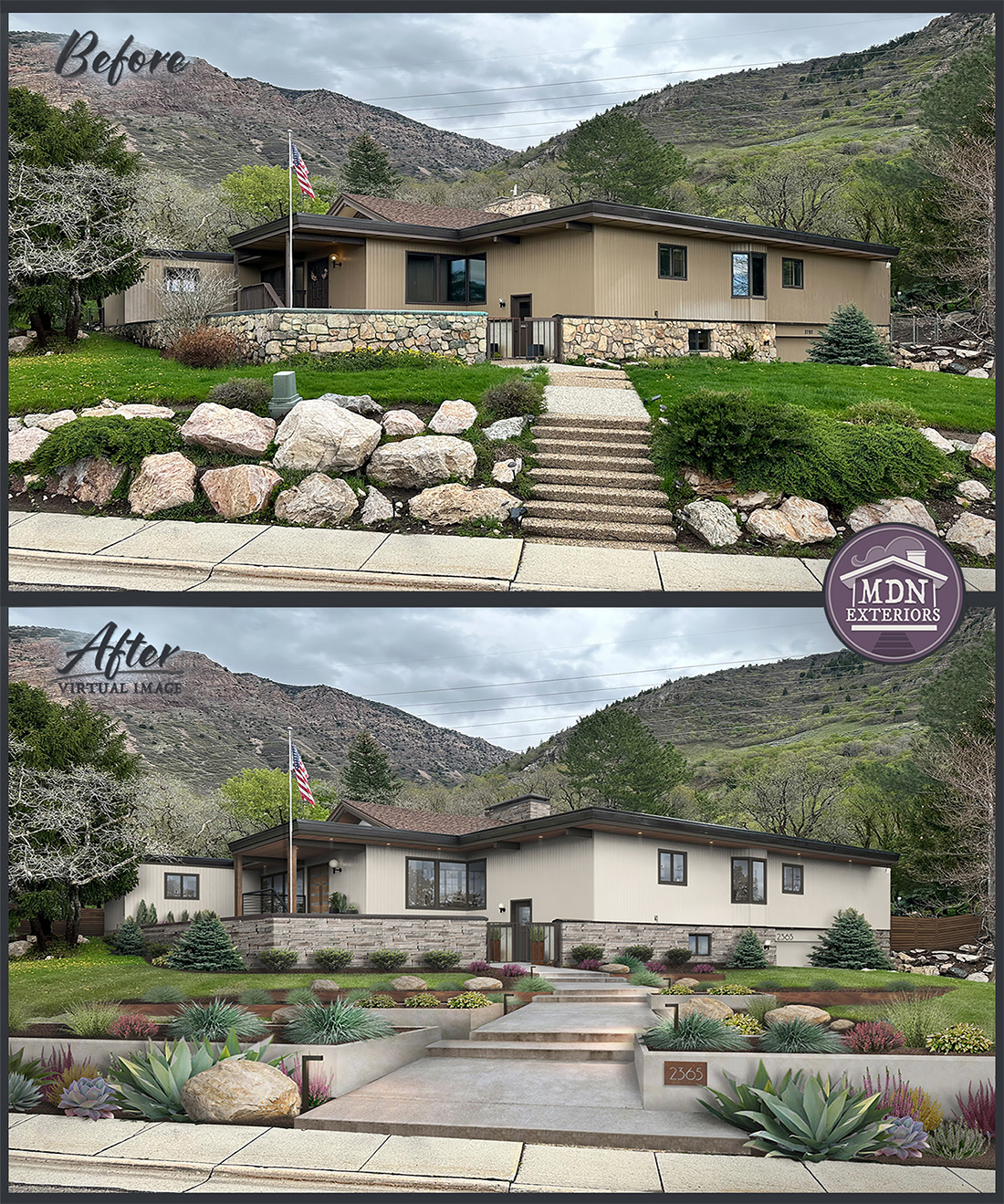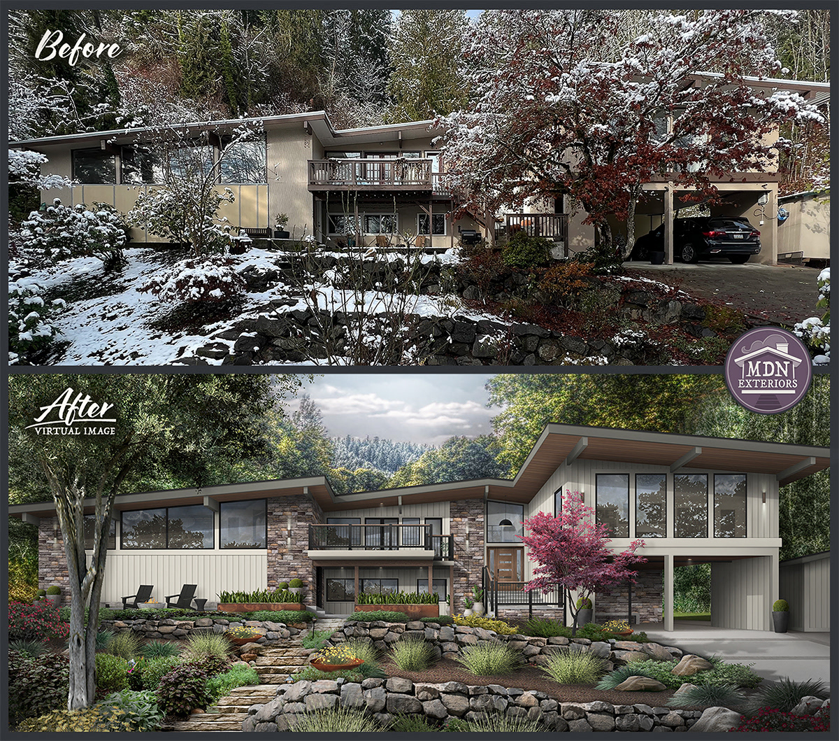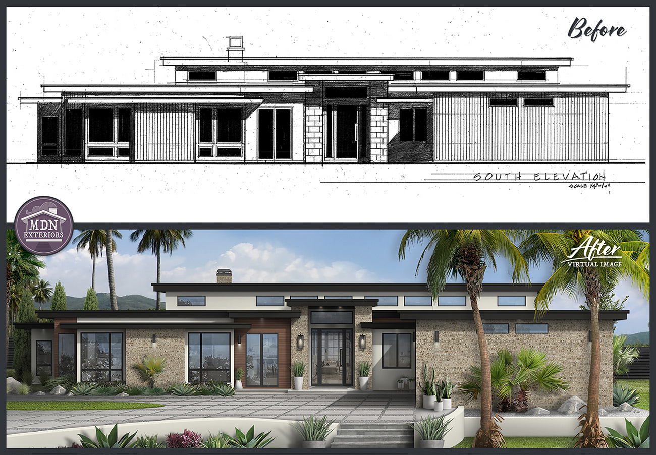 This design shows a strong Mid-Century Modern influence through its clean horizontality and integration with the landscape. Light vertical siding pairs with a modern stacked-stone base to add balance and texture. Dark-trimmed windows, cable railings, updated lighting, and a tiered, smooth concrete walkway complete the contemporary aesthetic