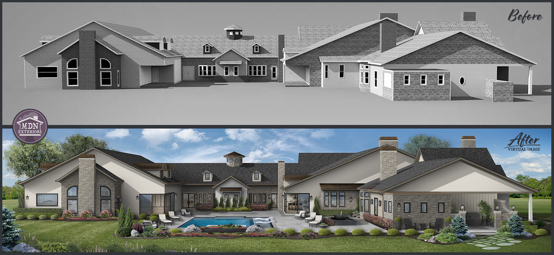 The transformation of this home shifts it from a traditional ranch into a Modernized Transitional style exterior. The deep charcoal siding and roof contrast elegantly with the existing brick, while the black-trimmed windows and new gable details introduce a modern farmhouse-inspired edge. The removal of the porch railing and addition of structured landscaping further streamline the look, giving the home a cleaner, more tailored presence.