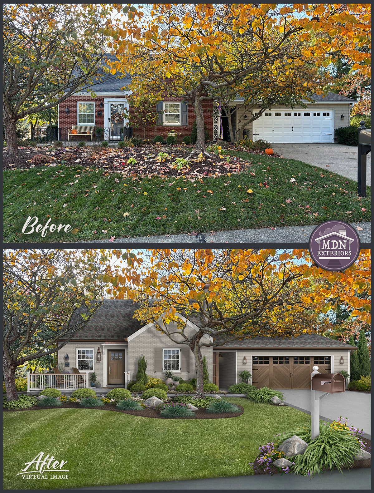 This redesign brings new life with a Transitional Cottage style. The “before” exterior’s dated blue siding and brick have been replaced with a rich, earthy palette that unifies the façade. Warm wood garage doors and timber porch posts add texture and charm, while refreshed landscaping creates a welcoming approach. The result is a timeless blend of cottage character and modern simplicity.