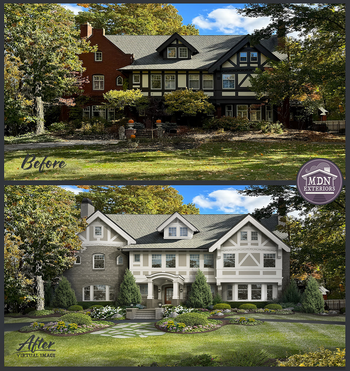 A charming Tudor Revival–style design with refined warm-gray stucco and brick stain, contrasted by cream trim, featuring steeply pitched mirrored gables, half-timber detailing, and an arched entranceway that enhance its stately, storybook presence. The neatly landscaped flower beds with symmetrical shrubs and colorful flowers further elevates its elegant curb appeal.